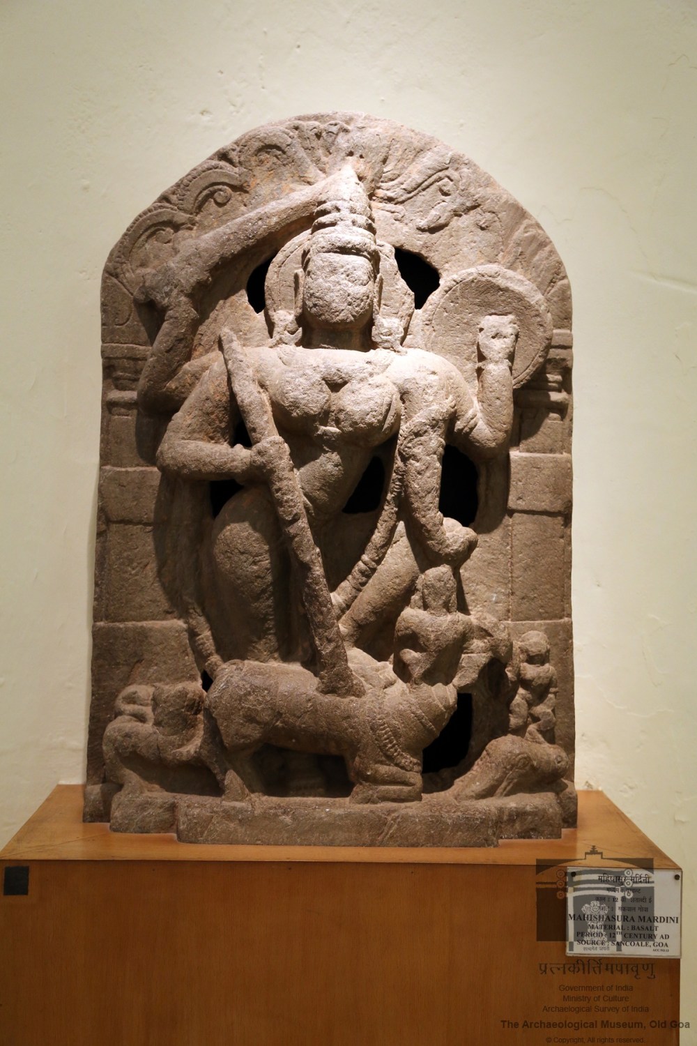 Mathura museum holds 6 statuettes of the Mahishasuramardini of the Kushana period from various sites in and around Mathura, of which one is four armed and the rest are 6 armed. According to Agrawala, a plaque kept in the Mathura museum belonging to the Kushana era depicting Mahishasuramardini is of particular interest. Here the devi is 6 armed, her upper hands hold an iguana, while her lower left hand holds the asura and she carries a sword in her right hand. Interestingly enough the asura here is in human form, and there is no buffalo (Agrawala, p.123, 1958). Agrawala also quotes from Mrs. Odette Viennot’s reports that an exhibit number 8622 in the Indian Museum (Kolkata) is likely that of a Kushana period Mahisasuramardini , where again she is holding an iguana in her upper arms (Agarwala, p. 124, 1958).