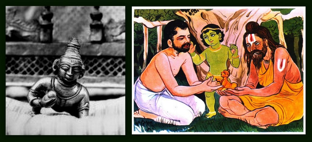 Thakur Ramakrishna Paramahamsa had deep bonds of love with the little deity of child Rama or Ram lalla . Ram lalla was the ishta devata of a ramaait sadhu named Jatadhaari from north india who had visted Dakshineshwar and stayed for some time on the banks of Ganga . During his stay Thakur was in mood of Ram sadhana . He began to see Ram lalla as a living entity . Ram lalla used to go to take baths in Ganga with Thakur but used to splash water and make a mess and refuse to leave water even when time was over . Ramakrishna had to admonish him repeatedly to get him out of water . Once when Ram lalla was hungry , Thakur gave him some flattened rice which he had at his disposal . The rice contained a few husks and ram Lalla cut his mouth . Seeing this Thakur began to cry saying – ” Maa Kaushalya had fed you with the best butter and kheer , and I gave you this crude rice to eat . How wretched am I ! “When the day arrived for Jatadhaari to leave , Ram lalla appeared to him in a dream and asked him to give himself to Thakur . Jatadhaari left Ram lalla in the loving care of Ramakrishna . He remained in the garbhagriha of Dakshineshwar untill he was stolen along with other valuables during a theft in the temple .Perhaps , in absence of the deep love that Thakur showered on him , Ram lalla chose to un-manifest himself forever .
