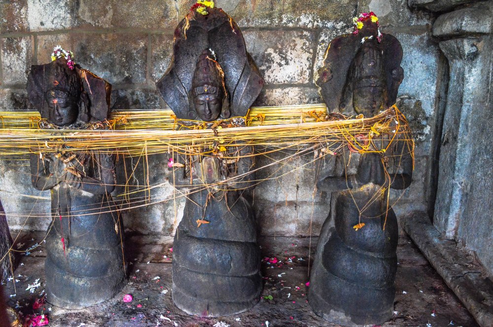 In South India the Naga worship has a stronger presence even today, and it is common to find Kavu or snake groves ( resembling the Nagavana of North India) usually known as Vishattam kavu or poison shrine or Nagakotta. That Naga worship was prevalent in Southern India from ancient times is known from an inscription at Banavasi written in Kannara, which records the erection of a snake stone in the middle of the 1st c. CE. Snake stones are still common in almost all villages in south India, and they are also frequently seen under vata or asthwa trees within temple complexes, or in separate shrines inside large temple complexes.