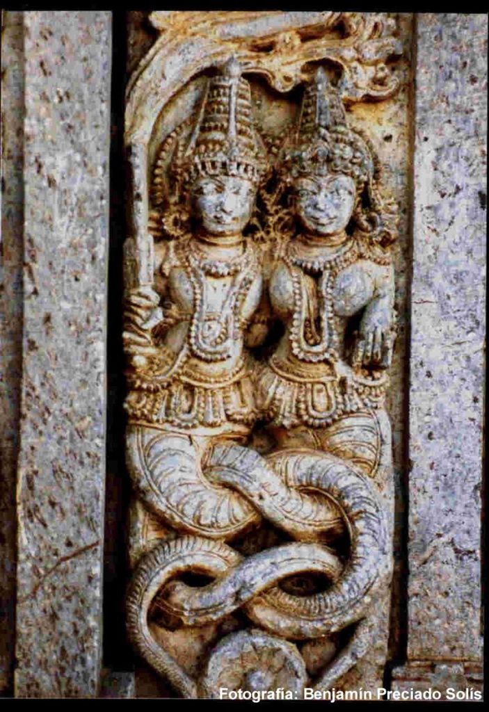 There are innumerable references to the Naga worship cult in the ancient Indian scriptures , such as the Vedas, Epics, Sutras and in many other literature. While the worship of the Naga was in its initial stages in the Rig-Veda, it became a regular object of worship in the Yajurveda, with offerings of various sacrificial items. The Rigvedic term Ahi budhyna, meaning the “serpent of the Deep” could be a represention of an atmospheric deity, with a figurative form of a serpent. Atharvaveda gives more details of the Naga worship and is filled with many charms and incantations against snakes, and also describes a rite for gaining the favour of the Naga devta on the full moon day in the month of Agrahāyaṇa/Mārgaśīra. Atharvaveda also mentions names of many snake gods (such as Asita, Rabhru, Kairata, Prsna, Apodaka, Taimata, etc) in different contexts, and sometimes associates them with the gandharvas, yaksas (punyajanas), apsaras: