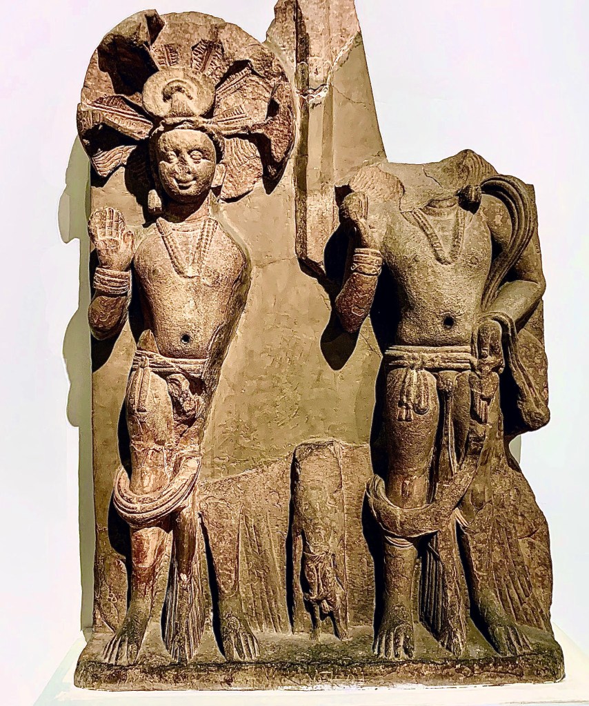 Besides Hinduism, Nagas have also found a place of significance in Buddhism, Jainism, Sikhism, and in other local and regional cults, as clearly evident from their religious monuments, sculptures, paintings, literature, tradition, and folk tales. The Buddhist text Cullavagga (v. 6) names four tribes of snake kings that are: Virupakkha, Erapatha (Elapatra), Chabyaputta, and Kanhagotamaka, of which the first two are well known in many Buddhist texts. The Buddhist texts also refer to the Naga chiefs Mucalinda, Apalala, Kaliya, etc. who all pay respects to Buddha in various contexts. Similarly Krishna’s victory over the Naga Kaliya in Mathura, speaks of the domination of the Krishna sect (Vaishnvism) over the more primitive Naga cult.