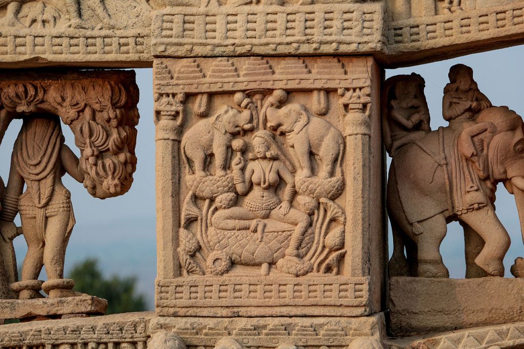 Bas relief of Gaja Lakshmi at the Sanchi Stupa, Stupa I, North gateway, Satavahana dynasty sculpture, 1st century CE. Lotus symbolizes water and Sri is always associated with lotus and waters.