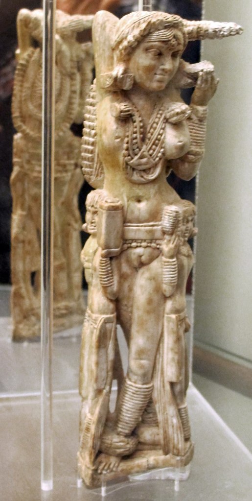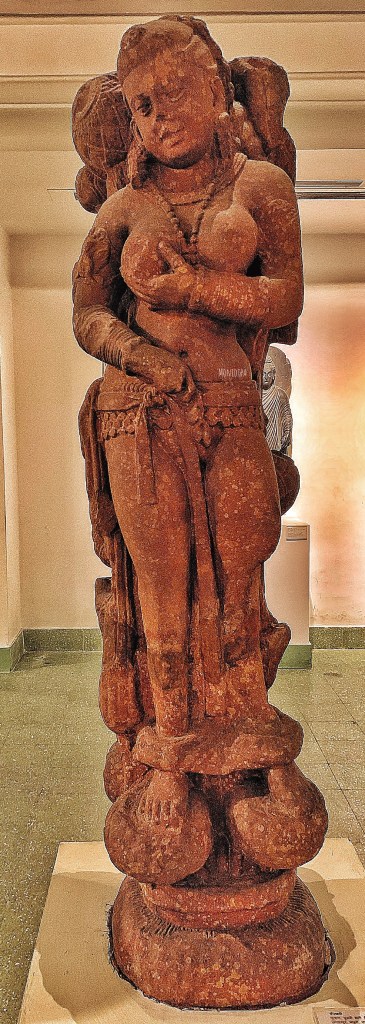 The variants of Sirima devta is seen across Sanchi, Bodh Gaya, etc. where sometimes the background changes showing a padmavana (a lotus forest). Sometimes a makara is also seen associated with the devi, as seen in a fragmentary coping stone from Amaravati of 2nd c. CE (makara being a mythical water creature and symbolising fertility; and as also the mother of Makaradhvaja or Kamdev). The much mutilated female figure which was found by Cunningham along with the Besnagar kalpataru capital is also that of Sri Lakshmi as identified by Banerjea. A rather unique form of the devi is seen from the Mauryan-Sunga period, as in terracotta figurines (one such is seen in Spooner’s list, number 550) where she is represented with unusual wings, heavy earrings, heavy bracelets, torque, and archaic styled costume.