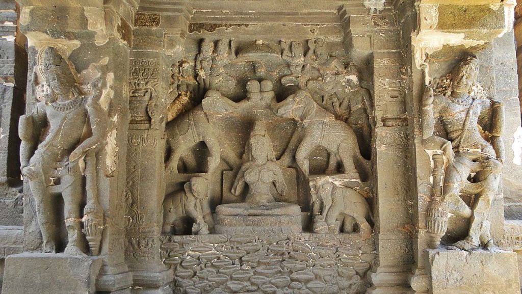 In Jaina literature, Sri-Lakshmi finds more importance, and in Paryusana Kalpa the abhiseya of Sri is one of the 14 auspicious dreams of Trisala (mother of Mahavira), which foretells the birth of this great Jina. The detailed description of it paints a fine imagery of the abhiseya, where Sri- Lakshmi of great physical beauty wearing a garland of gold coins (dinaras) rests on a lotus in a lotus pond amidst the surrounding peaks of the Himalaya, as the trunks of two elephants pour water on her. In the much later Jaina text Parisistaparvan, we find Sri devi described as holding a lotus and residing in Padmahrada in the Himalaya.