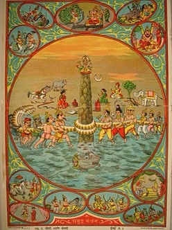 It is in the Epics that Sri-Lakshmi takes a firm shape as the goddess of wealth and prosperity, and is associated with kings and gods. Here Sri clearly stands for prosperity, perseverance, and success: the characteristics of victorious kings. In the Mahabharata and VishnuPurana Sri-Lakshmi is said to have been born out of the churning waters of the Ocean during Samudramanthan (her association with the waters has always been implied by the presence of lotus in her hands or around her). She is the wife of Vishnu and also the wife of Dharma; and the mother of Kamadeva ( as the mother of Makaradhvaja or Kamdev she carries the sign of makara on her hand in Mahabharata xiii, 11, 3). She is also Rukmini, the chief consort of Krishna and the mother of his son Pradyumna. As wife of Dharma, Sri is shown separate from Lakshmi, and in Mahabharata she is associated with abstract forms such as Pusti, Hri, Uma, Sarasvati, Kirti, Dyuti, etc. ; however barring this exception, Sri and Lakshmi are seen as one entity. Radha in connection with Krishna is also seen as the manifestation of Sri-Lakshmi in human form, in whom we find prem ras or love idealised and perfected. Some verses in the Mahabharata have also closely associated Kubera with Sri-Lakshmi and this ideological union between the goddess of prosperity and the god of wealth is easily understandable.
