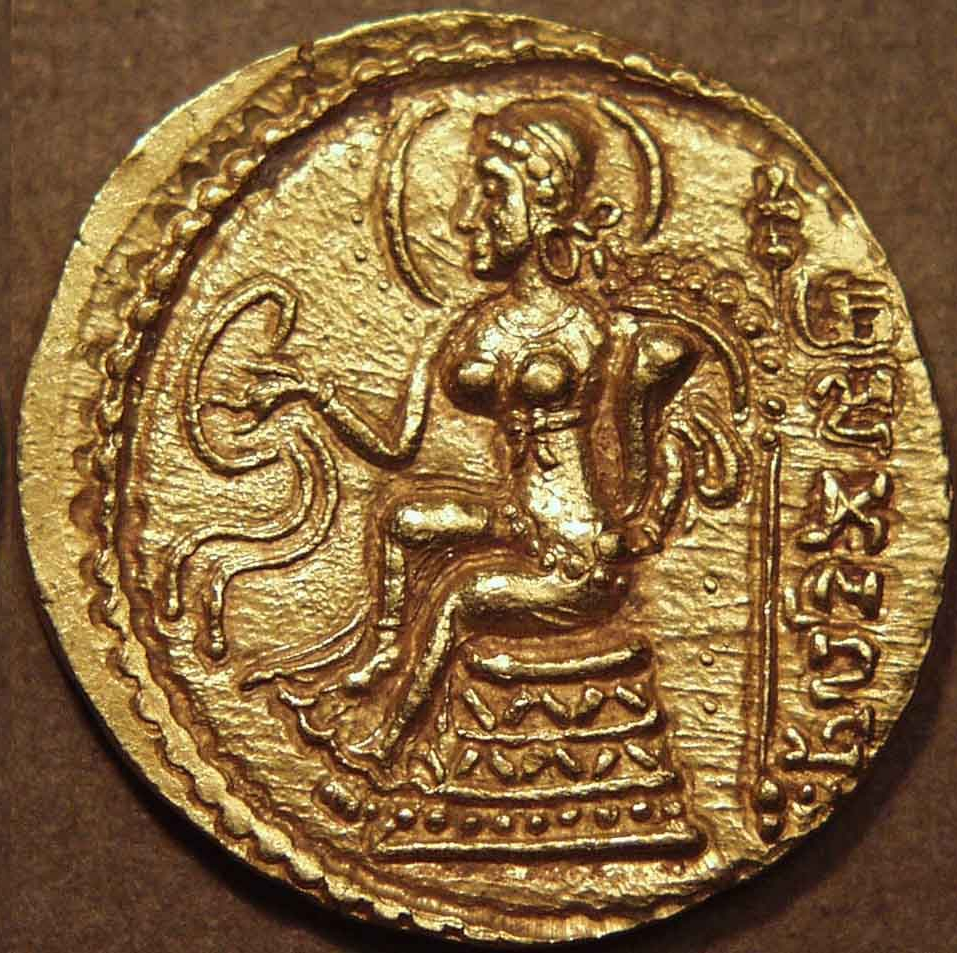 Sri Lakshmi without the elephants, either seated or standing on a fully blossomed lotus holding lotus in her hand is seen frequently on the coins of Ujjayini of various Hindu kings, such as Brahmamitra, Suryamitra, Vishnumitra, etc. Her hand is frequently seen in the coins of the Mathura satraps such as Sivadatta, Rajuvala etc. , on coins of Rajanya janapada, and coins of Bhadraghosa (Pancala). Sri Lakshmi also appears on the coins of the Gupta kings in various forms (one of which is an exact Indian counterpart of the foreign origin goddess Ardochso ), and is a constant on the coins from later periods.