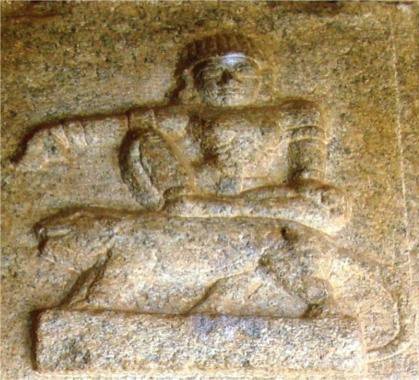 Gorakshanatha (Boganandishvara temple, Nandi, Karanataka) in ardhapadmasana. His left hand is resting on the left knee in a katya valambita mudra and the right hand and right leg on the tiger’s back in danda hasta mudra.