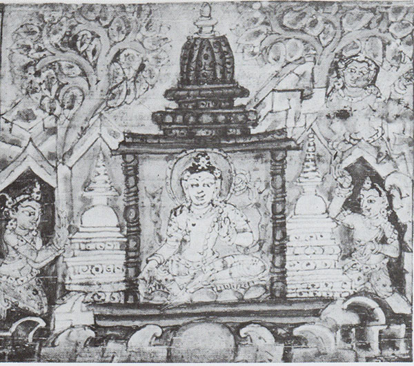 The third group of temples, the tiered type surmounted by a stupa, is known from a Lokanatha temple at Nalendra from a painting in a manuscript, and this style likely was from the tradition which led to the Abeyadana and Patothyama temples at Pagan (Myanmar). Here the roof rises in gradually receding tiers and is surmounted by a fairly large stupa. The corners at each stage are further decorated with miniature replicas of the stupa. No such structural temples now remain in Bengal.