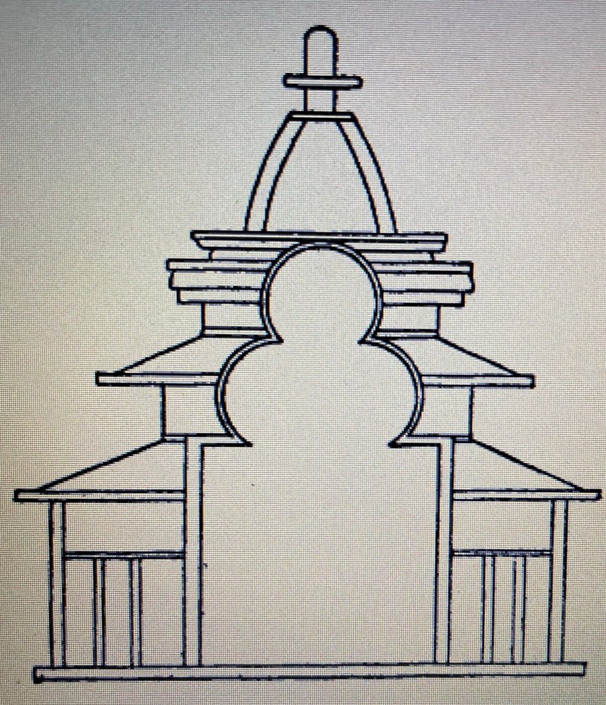 In the type 1 or tiered type of temples, as we have already seen, the shape is that of a highly stepped pyramid rising from the straight, perpendicular walls of the sanctum. They are made up of horizontal slabs of stones (pidas as they called in Odisha), gradually decreasing in size as they rise with a recess between each course. Over the last course is placed a huge amalaka sila on a narrow cylindrical neck, ultimately capped by the usual finials. This type of temple was once popular in ancient Bengal, and dotted the landscape is evident from the large number of representations of the images of such temples in sculptures across Bengal. The Ashrafpur bronze stupa dated 7th-8th c. CE gives us an idea in relief of this tiered temple. Here we find a simple roof consisting of two receding courses of sloping tiers with a recessed space in between and crowned by a peculiar finial ( in the drawing)