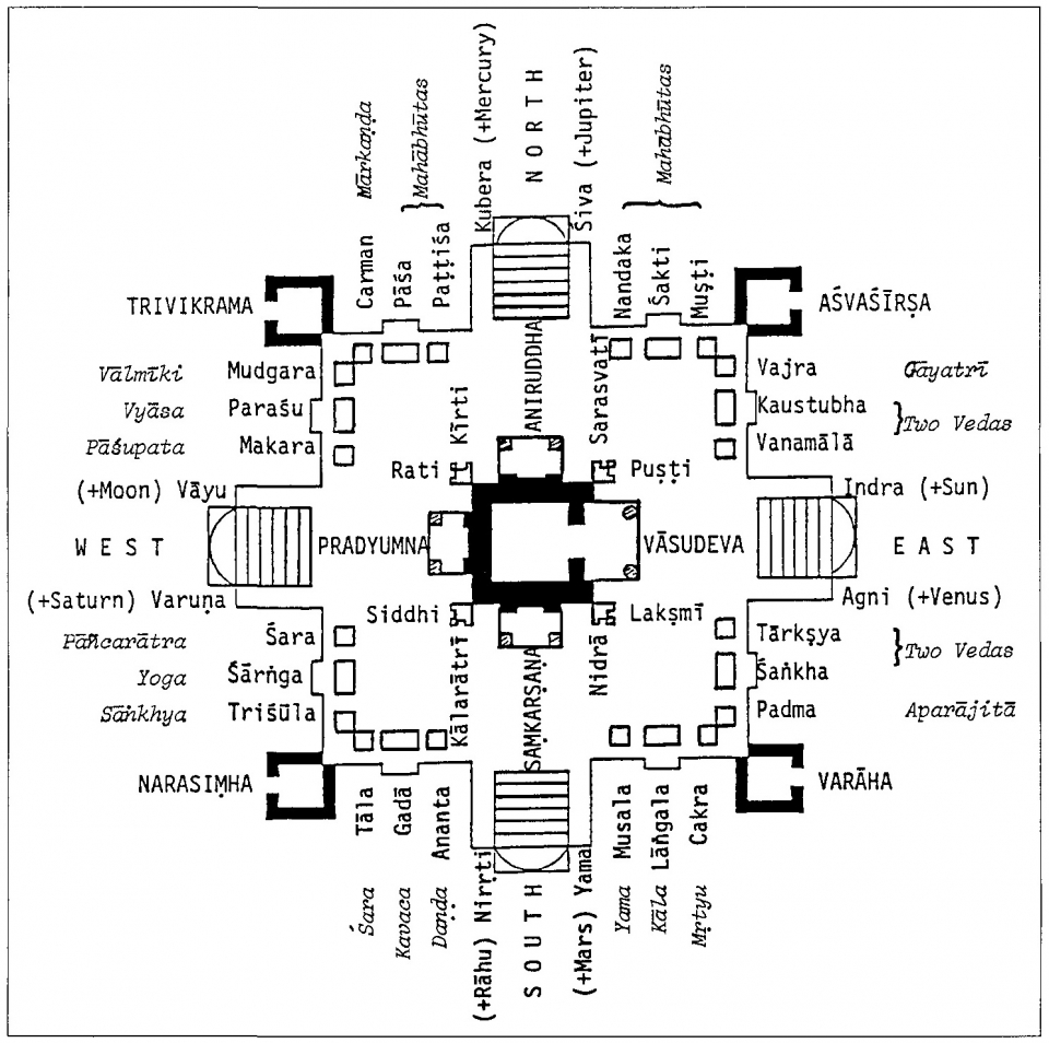 Iconographic scheme of the Sarvatobhadra temple. Panels around platform indicated in italics. image from ALEXANDER LUBOTSKY “Sarvatobhadra” temple of Vishnudharmottara Purana & vishnu temple of Deogarh