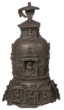 The The Ashrafpur bronze stupa dated 7th-8th c. CE (A). A digram showing the temple in relief where Buddha is sitting (B).