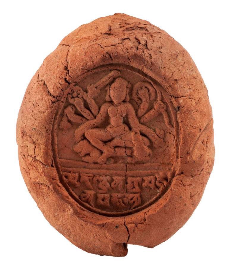 Moving to the common era, we find that Marshall described three seals from Bhita, which show a female deity standing with her left on hip and right hand outstretched. The scripts place the seals at around 2nd- 3rd c. CE, dedicated to Shiva, and the female figure is most likely that of Durga, consort of Shiva. Nalanda has also thrown up some interesting seals of the devi cult dated to the late Gupta period and early medieval era. While Nalanda mahavihara was primarily associated with Buddhism, the numerous seals of Hindu deities found from that site was found to have belonged to royal families, rural bodies/guilds of different janapadas, and private officials; thus, showing that the rulers and common people living outside the Nalanda mahavihara practiced mostly Hinduism. A seal depicting a four armed devi seated on a lotus carried by her simha vahana bears the name of Nalanda vihara with the legend reading as Srimad- Devesrari is probably devi Durga. On another seal from the same place the devi holds a gada, a sword, and a lotus, with an animal looking a buffalo below her. On another seal the devi is four armed carrying a sword, chakra, and a trisula. Another fragmentation seal shows a 6 armed devi riding a bull who is believed to be Maheswari, one of the matrikas, with rather unusual number of arms. A red clay seal with the legend reading Brahmani shows a devi with a pasa, trisula, lotus bud, and a kamandala; while another seal shows a simhavahini Durga. There are two more seals that depict four armed devis riding alligators or iguanas, something we have already seen in Mauryan era ring-stones. The most interesting among the Nalanda seal is a one that depicts a skeletal devi holding a skull-cap or kapala, trisula, a scythe, and a sword. She is pretasana, with a sunken belly and flesh-less look, and the attributes clearly place her as Chamunda. The abundance of these seals thus show that Nalanda and its surrounding areas were strong centres of Sakti worship during the late Gupta and early medieval period.