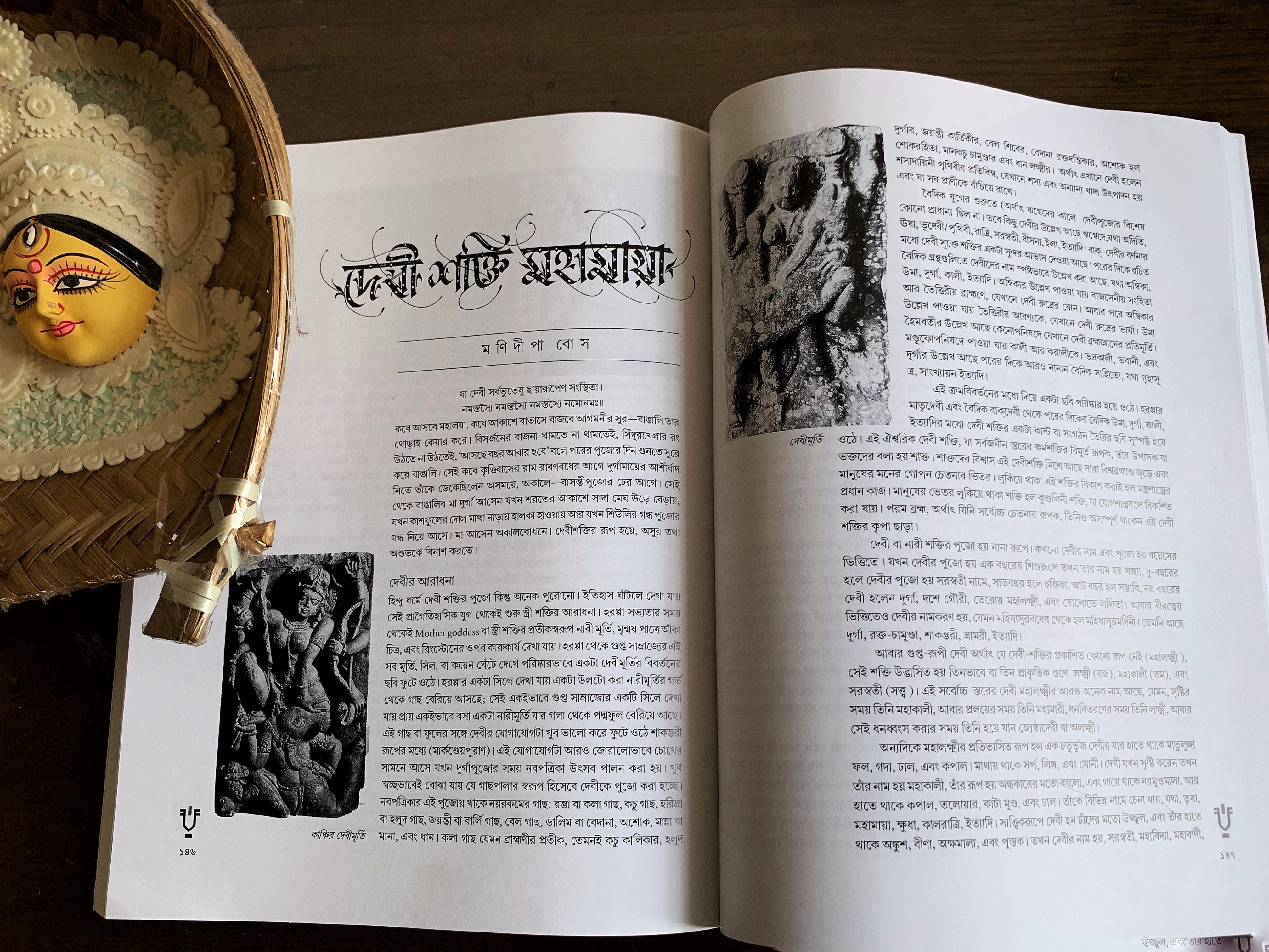 The seven-page long article in the heritage magazine discusses the worship of Sakti or female energy as Mahishasuramardini, Nabodurga, and Saptamatrika. It’s titled as: Devi Sakti Mahamaya.